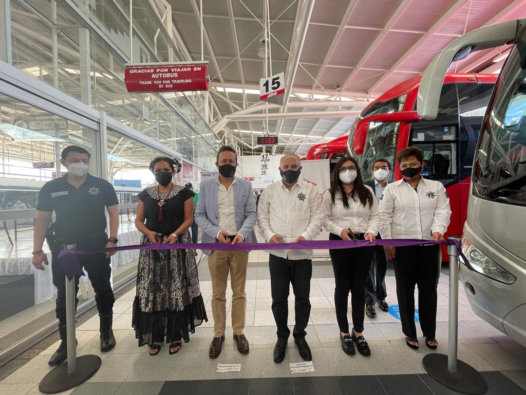 Oax. 29 de octubre de 2021. Resultado de un esfuerzo coordinado entre el Grupo Autobuses de Oriente (ADO), y la Secretaría de Seguridad Pública de Oaxaca (SSPO), este viernes, se dio el banderazo de arranque a la primera fase del programa:“Ruta segura para las mujeres”. Primera fase para el establecimiento de un protocolo que permita atender incidentes de violencia principalmente sexuales, durante los trayectos de las unidades a los distintos destinos de esta línea de autobuses.