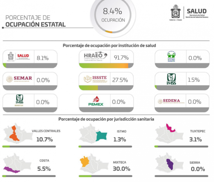 Oaxaca de Juárez, Oax. 5 de abril de 2022.- Los Servicios de Salud de Oaxaca (SSO) indicaron que este 5 de abril se hospitalizaron a seis nuevos pacientes positivos a COVID-19, para un total de 30 personas que se encuentran internadas por presentar complicaciones por la enfermedad.