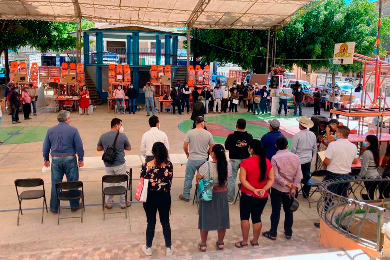 En un acto realizado en la explanada principal de Santo Domingo Teojomulco, en presencia de autoridades municipales y comités de padres y madres de familia, con apego a las medidas sanitarias decretadas, se distribuyeron equipos de cómputo, lotes de mesas y sillas para aulas, mesas de trabajo, pizarrones, material de aseo, deportivo y de oficina, así como botes de pintura.