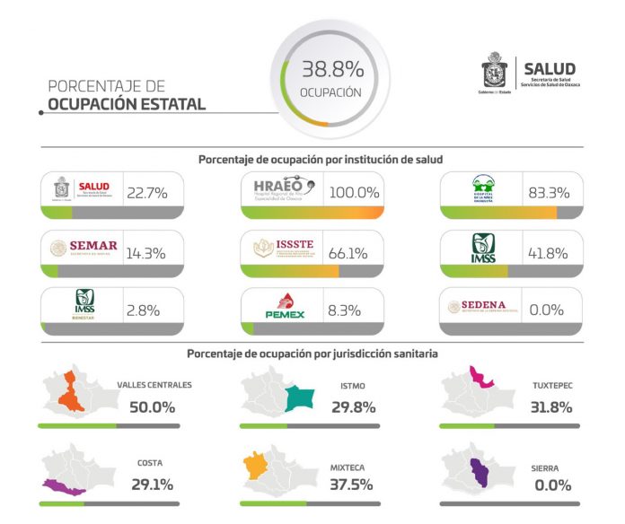 La Jurisdicción Sanitaria de Valles Centrales, registra un porcentaje de camas ocupadas del 50%, seguido de la Mixteca con 37.5%, Tuxtepec con 31.8%, Istmo 29.8% y Costa 29.1%.