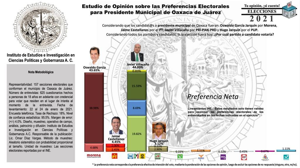 Esta encuesta realizada por el Instituto de Estudios e Investigación en Ciencias Políticas y Gobernanza A.C. incluyó a ciudadanos y ciudadanas de la ciudad de Oaxaca, quienes respondieron a un cuestionario donde dejaron claro su inclinación hacía Villacaña sobre García Jarquín.