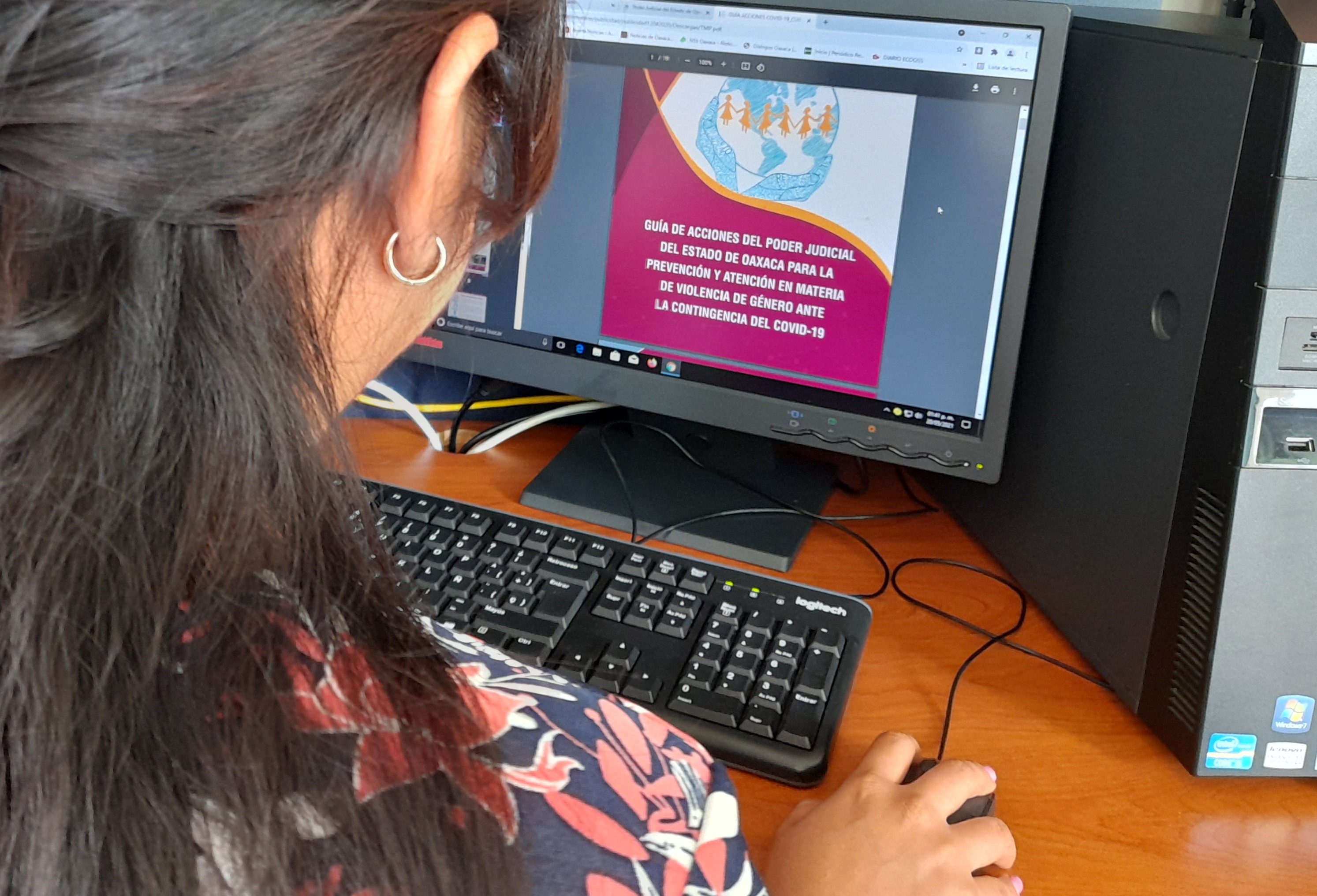 Dentro de las actividades para la protección de mujeres, niñas y niños en este periodo de pandemia, se implementó la Guía de acciones del Poder Judicial del Estado de Oaxaca para la prevención y atención en materia de violencia de género ante la contingencia del Covid-19, cuya finalidad es adoptar medidas de cuidado ante el aumento de la violencia de género y dar a conocer los medios judiciales con los que se cuentan para poner fin a estas situaciones