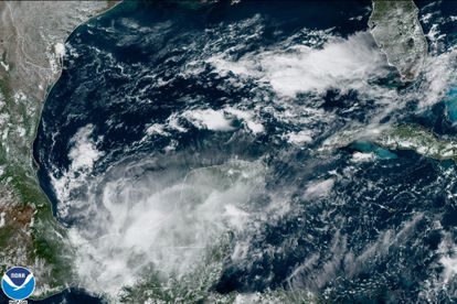 This satellite image taken at 2:16pm ET and provided by NOAA shows Tropical Storm Karl over the Yucatan Peninsula and Chiapas, Mexico, Friday, Oct. 14, 2022. (NOAA via AP)