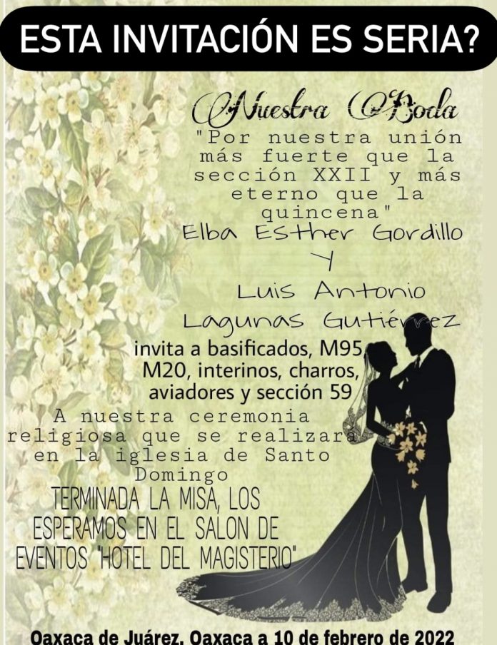 Las rijosas hordas del Cartel22 -adversarios políticos históricos de la maestra- lanzaron ayer panfletos, a manera de invitación a la boda, con la amenaza de amargarle su luna de miel que tiene, o tenía, planeado disfrutar en esta ciudad después de la unión religiosa con su joven abogado en el templo de Santo Domingo.